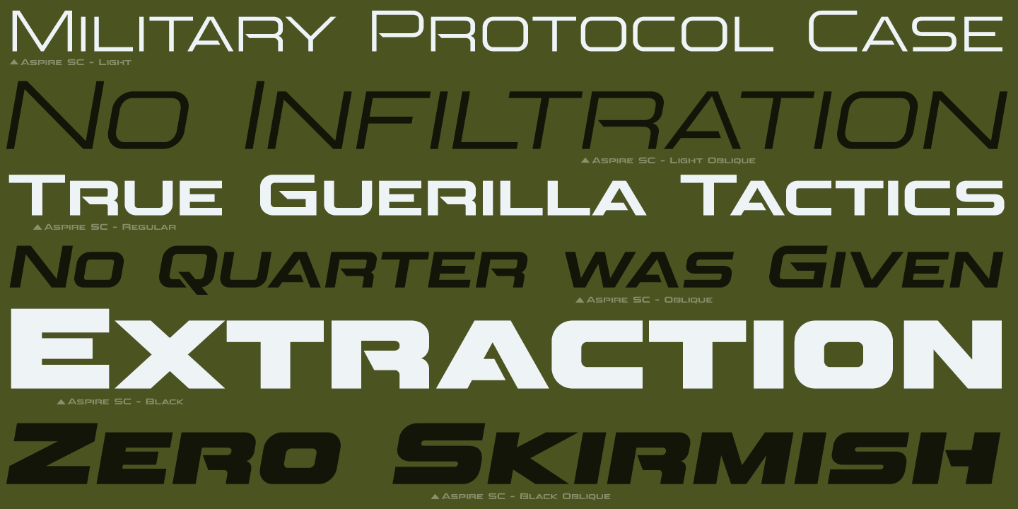 Aspire Narrow SmallCaps is perhaps the most true to form tribute to the original all capitals inspiration logotype. It maintains all capital forms (whether standard or smallcaps) and yet is still strikingly powerful in its presence and readability including numerals, and a comprehensive range of weights, creating a straightforward, uncompromising collection of typefaces that lend a solid foundation and a broad range of expression for designers.