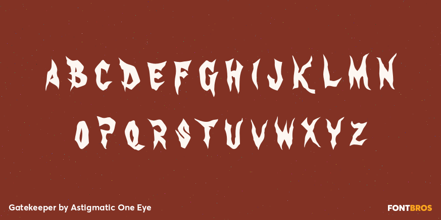 Buy NowThe GateKeeper typeface was inspired by old horror movies, and the various poster typography that went with them. A loose and pointy typestyle, GateKeeper embodies the dark side of typography, with a creepy and on edge feeling. Usable for any occassion, but most suitable for dark matter.