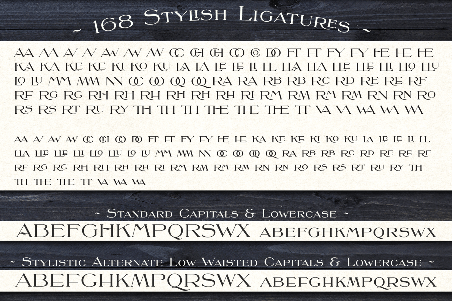 - Stylistic Alternates - alternate low-waisted letterforms and alternate forms.