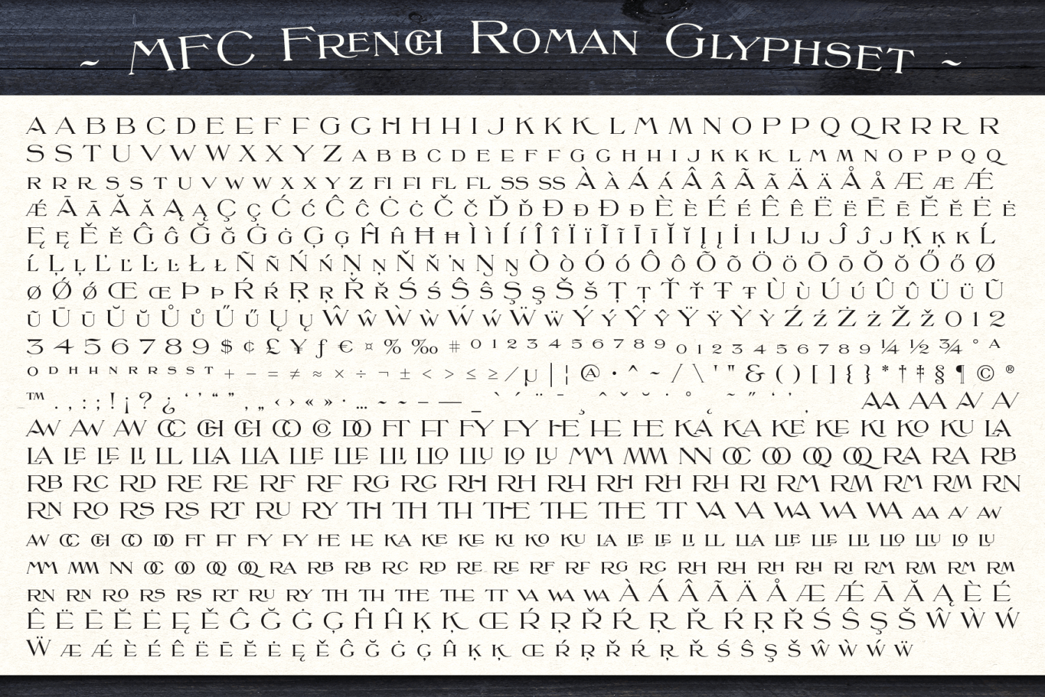 - 716 glyphs in MFC French Roman - including Capitals, Lowercase, Numerals, Punctuation and an extensive character set that covers multilingual support of latin based languages. (see the last graphics for a preview of the characters included)