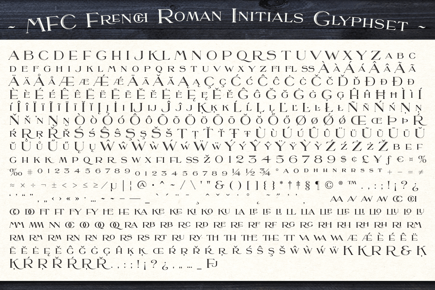 - 586 glyphs in MFC French Roman Initials - including Capitals, Lowercase, Numerals, Punctuation and an extensive character set that covers multilingual support of latin based languages. (see the last graphics for a preview of the characters included)