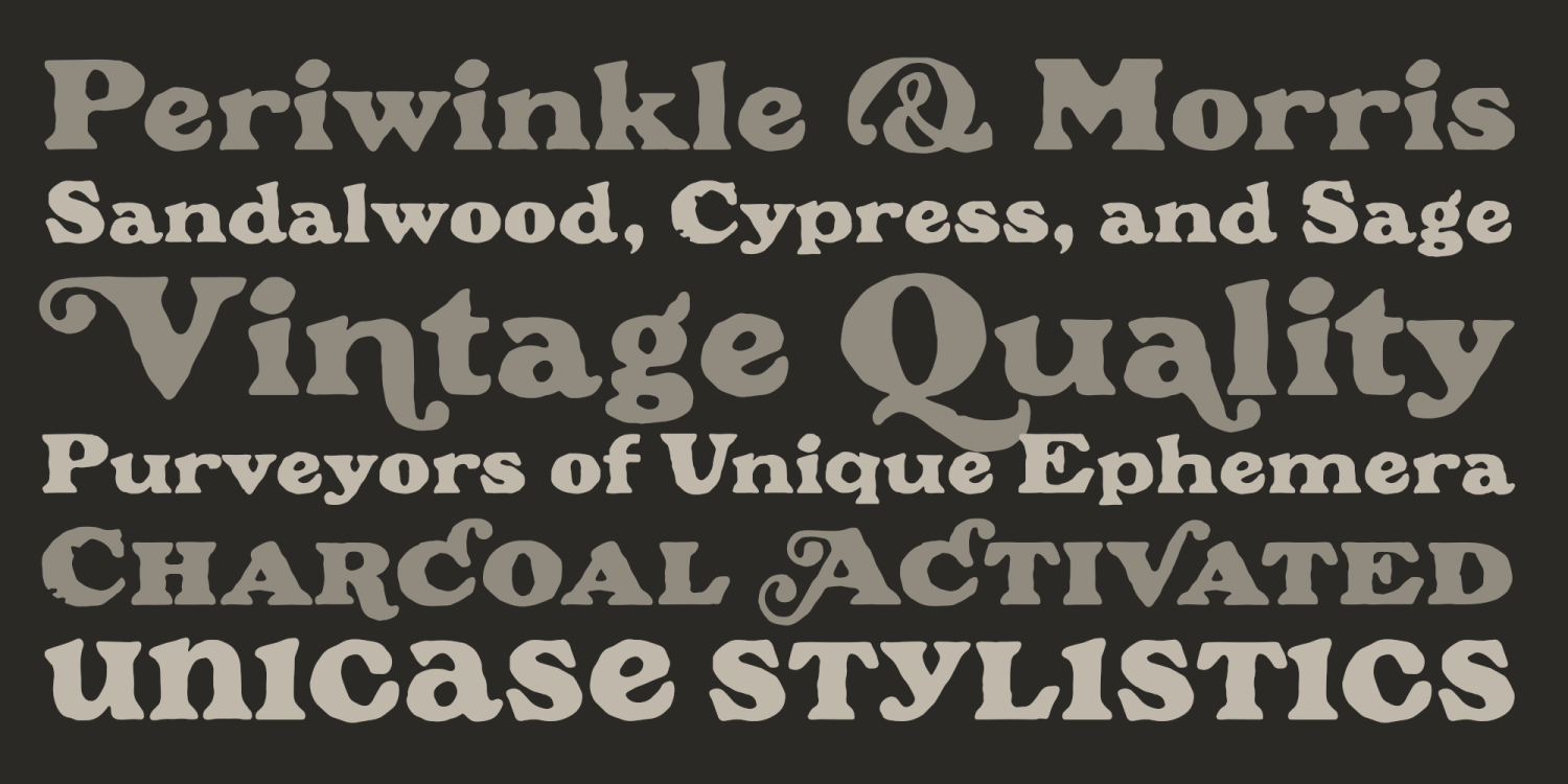 The expanded SmallCaps option for Pennyroyal Pro gives the typestyle a more sophisticated option, while the expansive options like Unicase and Swashes allow for more uniqueness, play, and experimenting far beyond the original typeface inspiration.